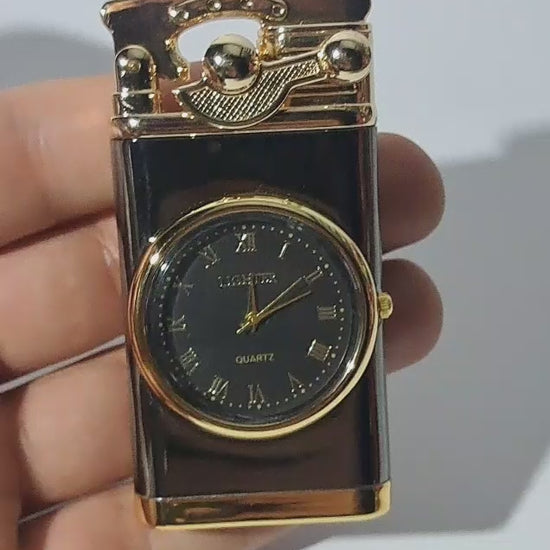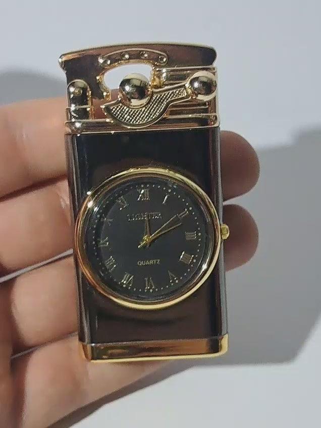 Upgrade your collection with this luxury torch lighter featuring a built-in quartz watch. Designed for style and performance, this refillable butane jet flame lighter combines elegance with practicality. The vintage-inspired design, Roman numerals, and gold accents make it a perfect gift for men who appreciate fine details.